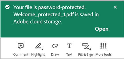 A confirmation appears, and a copy named “<filename>_protected.pdf” is saved to Adobe cloud storage.