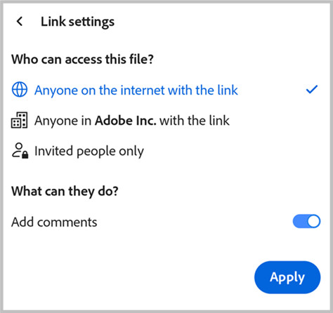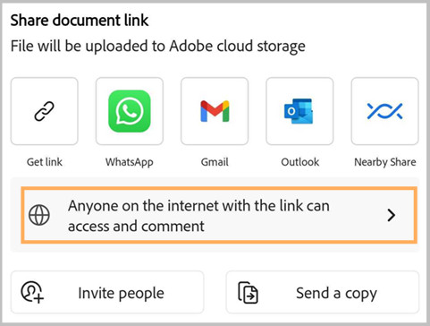 For enterprise users, the Anyone in <organization> with the link option is selected by default. Enterprise admins can manage user access via the Adobe Admin Console. These settings are unaffected by the access controls in Acrobat.