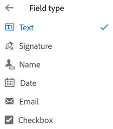 Acrobat supports following field types: text, signature, name, date, email, and checkbox. By default, the added fields are assigned to the first recipient.