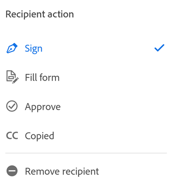 To change the assigned recipient, tap the field and select another recipient from the pop-up menu. Note that only the recipients with Sign role appear in the list of signers here.