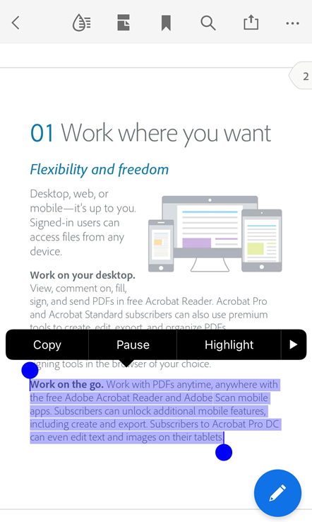 With the Speak Selection feature, you can make Acrobat Reader app read the selected text to you out loud. To use the Speak feature, you need to enable Speak Selection in the device settings. To do so: