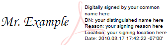 Signature: A graphic that identifies the signer on the left-hand side of the appearance, such as a photo or scanned signatures. Transparent backgrounds allow a watermark to be visible in the underlying layer.