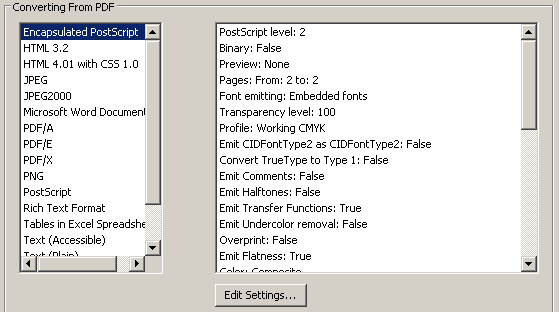 Defines the settings which control conversion of documents from PDF to other formats. All of these settings can be user controlled via