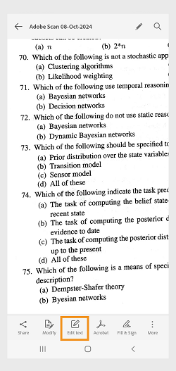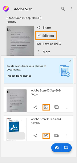 Open your Adobe Scan app. In the Home screen, you get an option to Edit text next to every document displayed. Tap