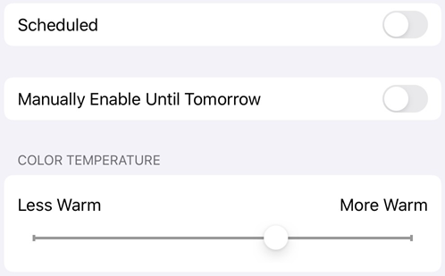 Konfiguriere die Einstellungen. Je nach Betriebssystemversion kannst du den Night Shift-Modus planen, die Funktion manuell aktivieren und den allgemeinen Farbton steuern.