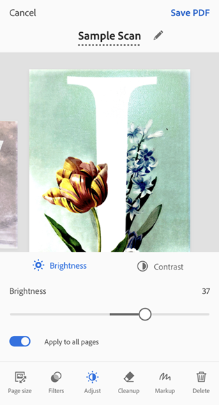 und wähle deine bevorzugten Optionen aus dem unteren Menü aus, um deine Scans zu ändern. Um Text in deinen Scans zu bearbeiten, verwende die Integration der Adobe Scan-App mit der Adobe Acrobat Reader-App.