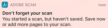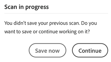 Du kannst auf Weiter tippen, um mit der Arbeit am Scan fortzufahren, oder auf Jetzt speichern, um deine nicht gespeicherte Aufnahme zu speichern. Wenn du Benachrichtigungen aktiviert hast, lösen nicht gespeicherte Scans auch eine Benachrichtigung aus, die auf dem Gerätebildschirm angezeigt wird. Du kannst auf die Nachricht tippen, um die Scan-App zu öffnen und die Aufnahme zu speichern.