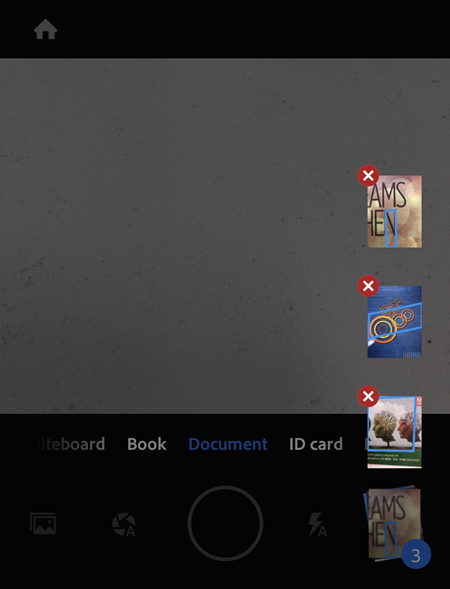 Long press the thumbnail to view your last 3 scan thumbnails–you can delete these captures now or later. Tap the thumbnail to end your scan session and modify the file. |