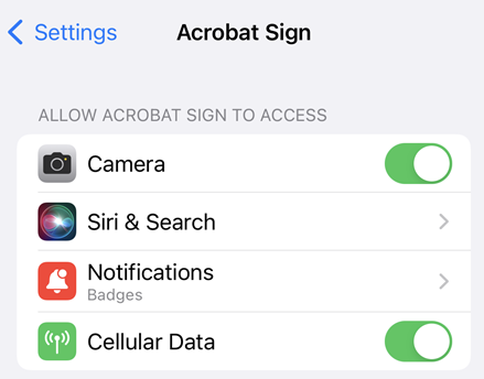 Para simplificar os fluxos de trabalho do Adobe Acrobat Sign, permita o acesso à sua localização, câmera, fotos e a outros recursos do dispositivo. Quando tentar usar um recurso que exija uma dessas funcionalidades pela primeira vez, você será solicitado a permitir o acesso. Ative e desative o acesso conforme necessário. Para compartilhar o acesso: