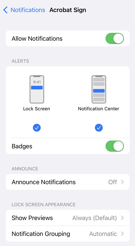 Você pode usar as configurações do Adobe Acrobat Sign para pré-configurar os recursos de fluxo de trabalho, acesso a documentos, uso de dados de celular e muito mais.