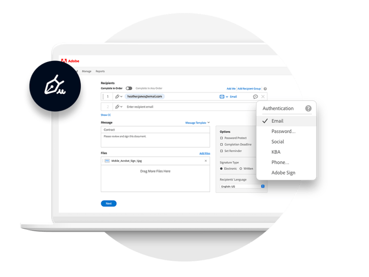 Nogle gange har du et dokument, som har behov for et højere sikkerhedsniveau med henblik på underskriver- eller brugergodkendelse. I et sådant tilfælde sørger Acrobat Sign for at dække dine behov, og tilbyder flere forskellige metoder med avanceret godkendelse herunder SMS, vidensbaseret godkendelse og offentligt id.