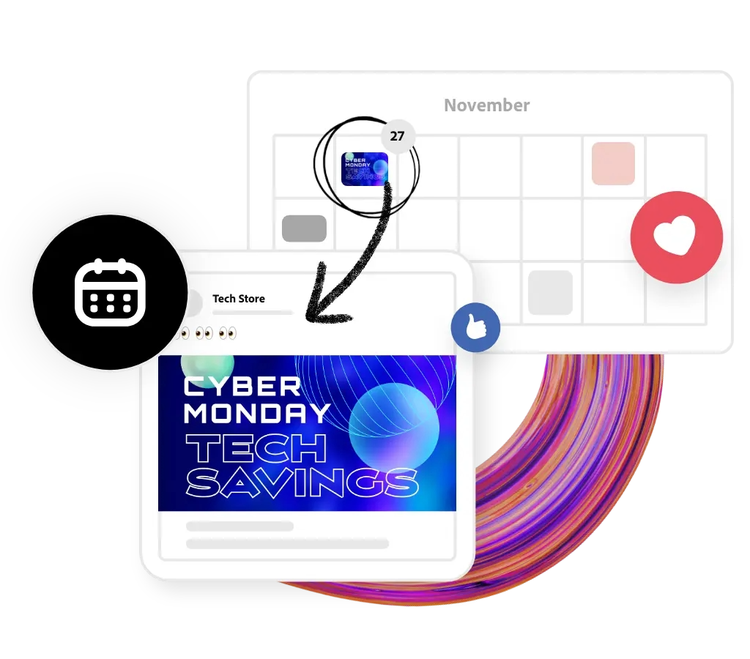 Spar tid og styrk dit brand med Indholdsplanlægning til Adobe Express. Opret, planlæg, se et eksempel på dit indhold, og planlæg opslag på tværs af TikTok (nyt), Instagram, Facebook, X (Twitter), Pinterest og LinkedIn med lethed – tilgængelig på computer og i vores mobilapp.