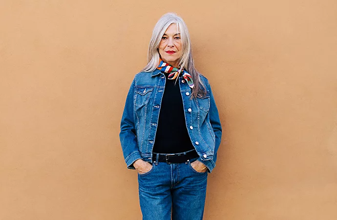 Model posing in front of a tan background