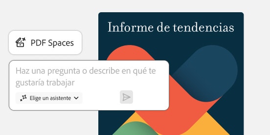 Obtén información valiosa en menos tiempo, crea contenido excepcional con Adobe Express y disfruta de las herramientas de PDF en las que ya confías, todo ello en un mismo sitio. PDF Spaces convierte archivos estáticos en centros de conocimiento interactivos, con un asistente de IA personalizado para obtener información más detallada. Además, podrás experimentar nuevas formas de usar la tecnología de IA para generar presentaciones.