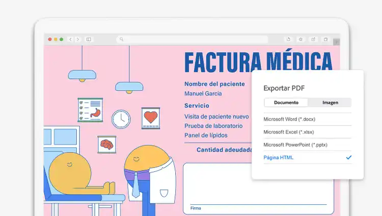 Convierte tus PDF en otros tipos de archivo, incluido Microsoft Word, Excel, PowerPoint y formatos de imagen tales como .jpeg y .png.