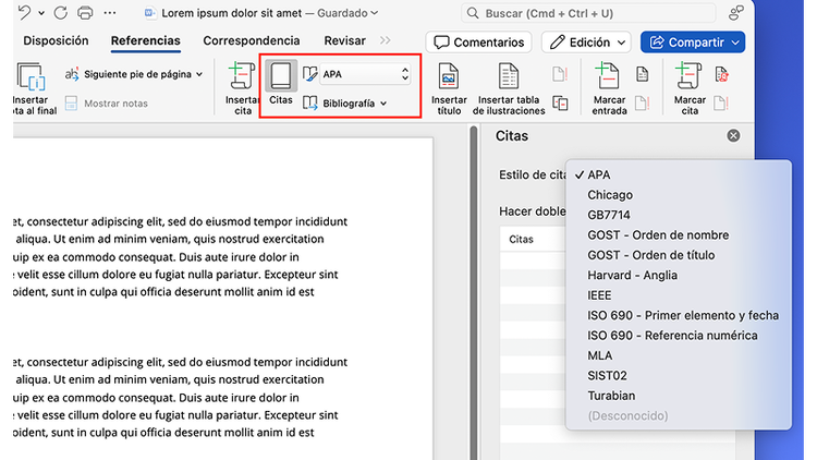 - En el grupo Citas, despliega y selecciona el formato que te haya indicado tu universidad (p. ej., APA o ISO 690-Referencia numérica).