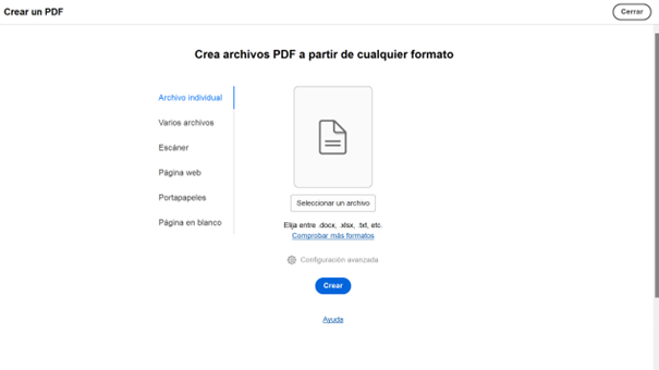 - Abre la herramienta Crear un PDF y arrastra uno o más archivos de datos al área seleccionada.
