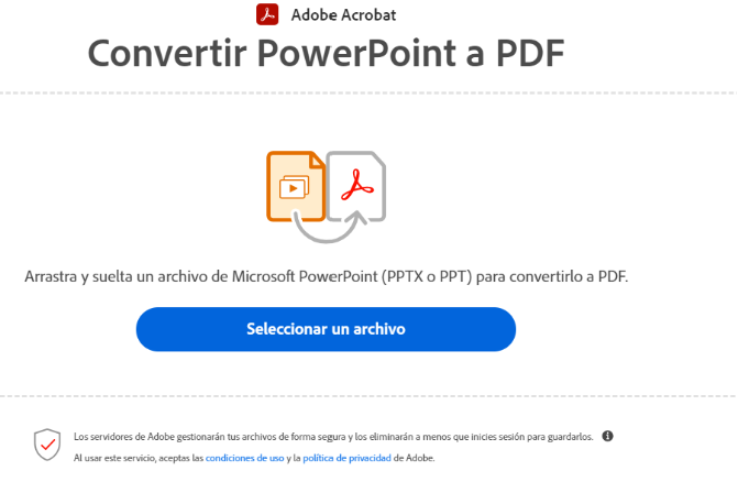 - Abre la herramienta Convertir PPTX a PDF en Adobe Acrobat Online.