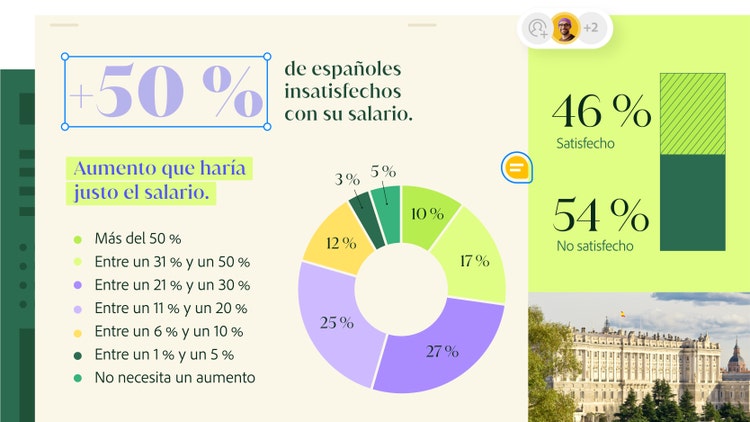 - Mientras que un 73 % dice estar a gusto con su trabajo, solo un 46 % se muestra conforme con lo que cobra. Solo el 5 % de los españoles creen que no necesitan un aumento de sueldo.
