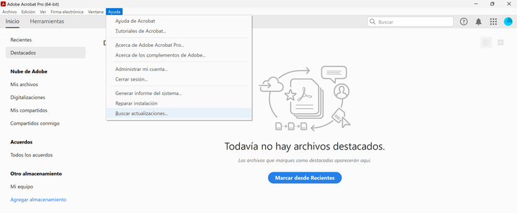 - Actualiza Adobe Acrobat. A veces el problema se debe a una versión desactualizada. Abre Acrobat, selecciona Ayuda > Buscar actualizaciones y sigue las instrucciones.
