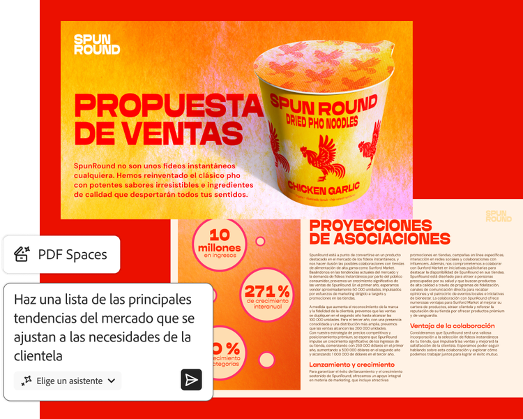 Con Acrobat Studio o el complemento Asistente de IA de Acrobat, podrás obtener información de documentos PDF, archivos de Microsoft 365 y enlaces web. Valida las respuestas con citas precisas. Resume documentos y formula preguntas con PDF Spaces y un Asistente de IA preconfigurado.