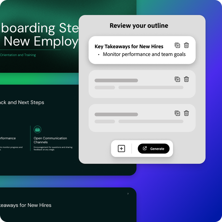 Indica la idea que tienes y Adobe Express generará diapositivas impresionantes.
