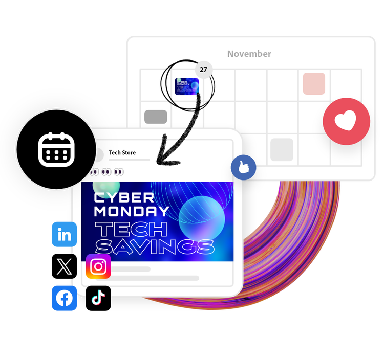 Ahorra tiempo y consigue que tu marca crezca con el programador de publicación de contenido de Adobe Express. Crea, planifica, previsualiza contenido y programa tus publicaciones para TikTok (Nuevo), Instagram, Facebook, X (Twitter), Pinterest y LinkedIn fácilmente —ahora disponible en la versión de escritorio y en nuestra aplicación móvil—.