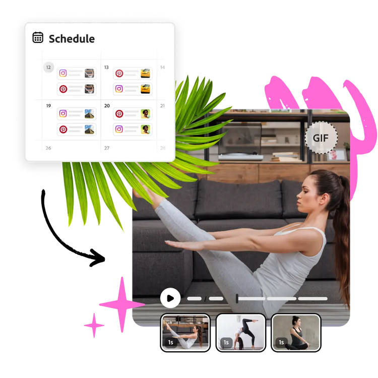 Crea GIF espectaculares para presentar productos nuevos en una historia de Instagram, crea un meme para mostrar transformaciones tipo “antes y después” o crea una entrada de Facebook que resalte las distintas posturas de yoga que se practicarán en la próxima sesión. Cuando termines, utiliza el Planificador de contenido integrado para programar y publicar tus entradas de redes sociales en tus canales favoritos.
