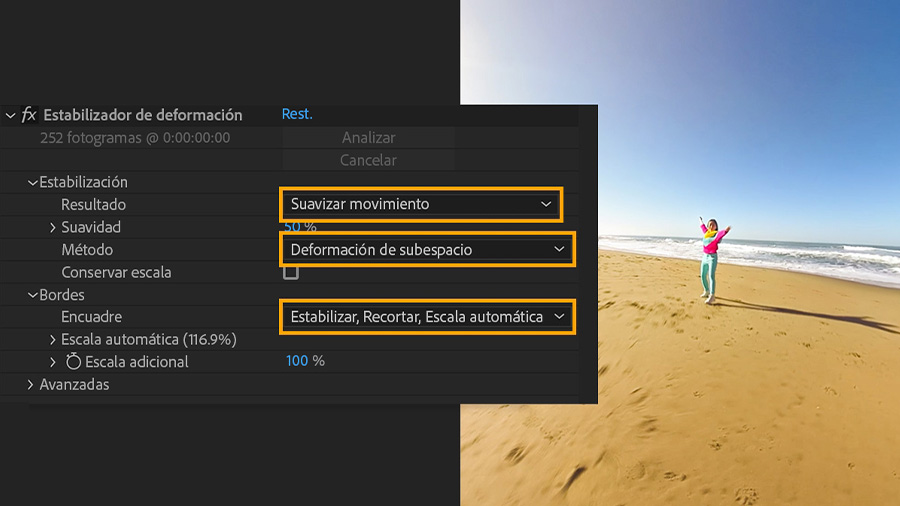El Estabilizador de deformación suele dar buenos resultados. Sin embargo, si quieres perfeccionar el efecto, por ejemplo, mediante el ajuste del escalado y el recorte, puedes editar la configuración en el panel Controles de efectos (Ventana > Efecto > Controles).