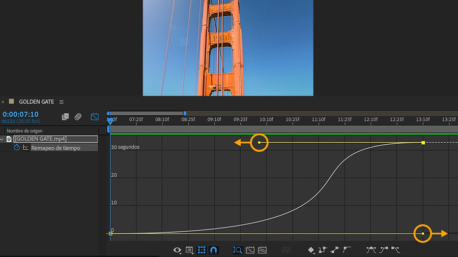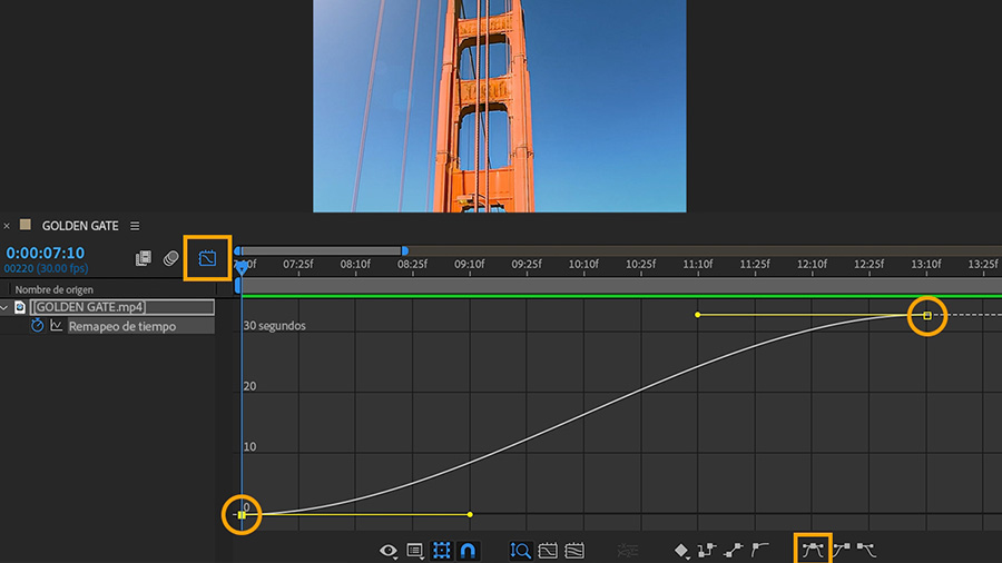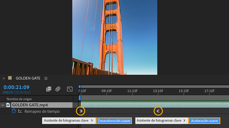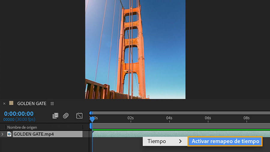 Haz clic con el botón derecho en la línea de tiempo y selecciona Tiempo > Activar remapeo de tiempo, para que puedas aplicar una curva de velocidad y alternar entre movimientos lentos rápidos a fin de imbuir dramatismo.