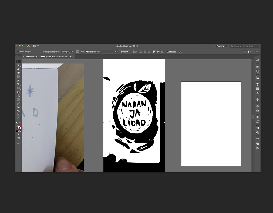 Selecciona la imagen con la herramienta Selección que encontrarás en la barra de herramientas de la izquierda. Verás que aparecen varias funciones en la barra Control de la parte superior de la pantalla. Elige Calco de imágenes para convertir tu imagen dibujada a mano en un dibujo vectorial. Haz clic en la flecha desplegable situada a su lado y elige la opción más adecuada para tu diseño (por ejemplo, Blanco y negro). Y deja que Illustrator haga magia.