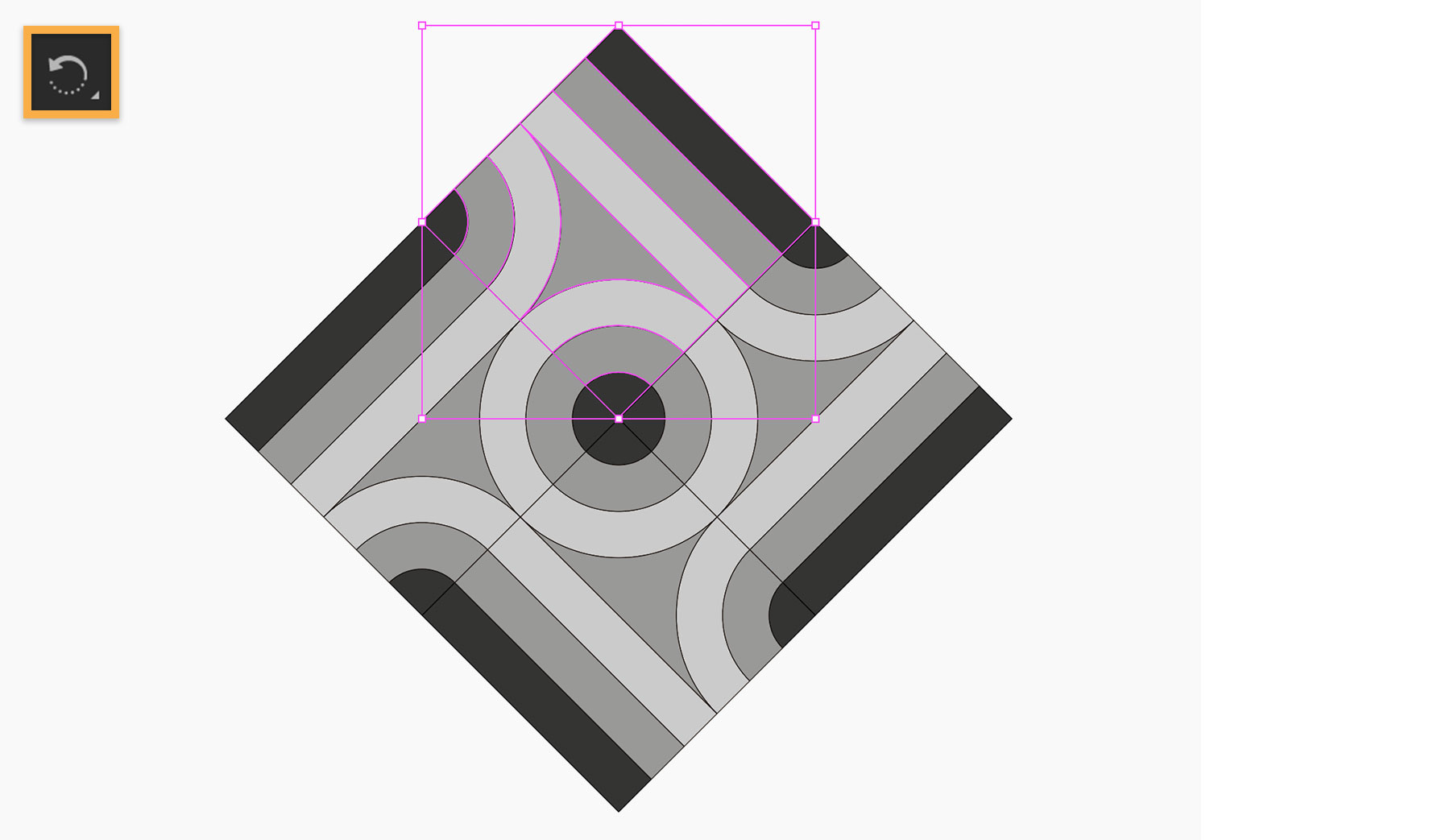 Daniele agrega rellenos en escala de grises para distinguir partes de la pauta. Luego crea una sección transversal del mosaico de base para conectar secciones más grandes de la pauta más adelante en el proyecto. Para ello, duplica un rectángulo vacío desde la parte superior izquierda de la tesela, lo lleva al frente y lo usa para cubrir el lado inferior derecho de la pauta básica. Luego, usa la función Recortar en la herramienta Buscatrazos para crear una parte de la pauta principal. Oculta esta capa adicional hasta que la necesita.