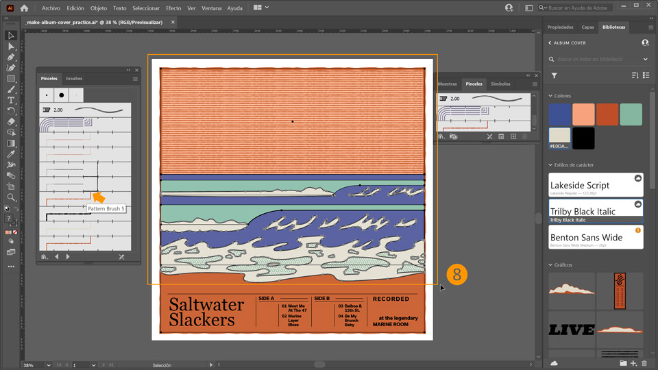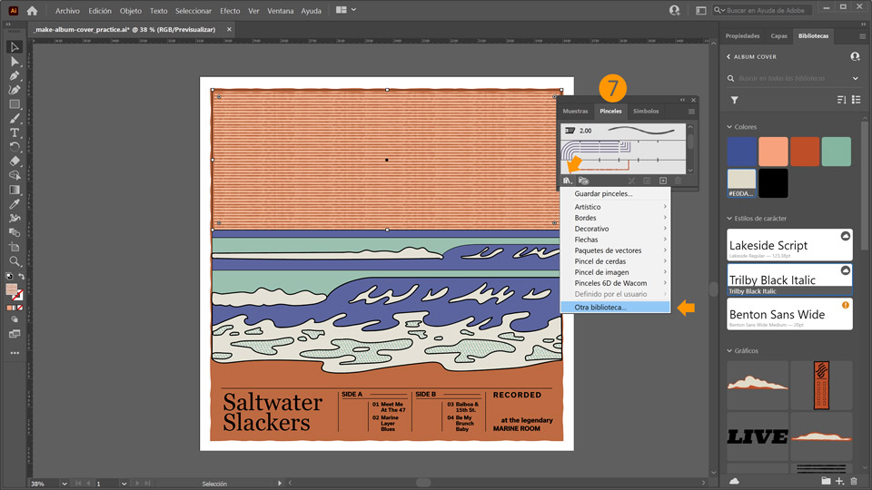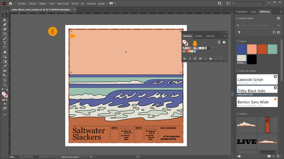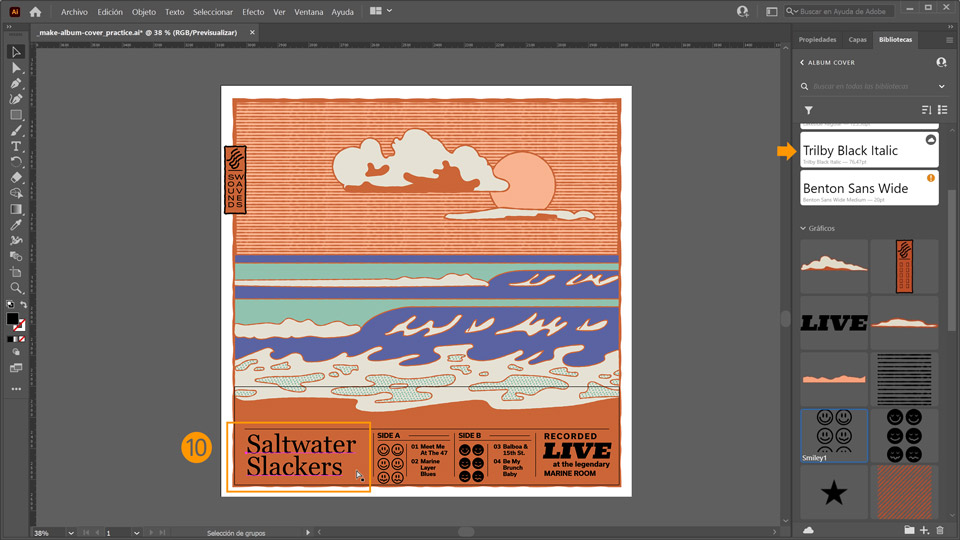 10. Por último, selecciona el texto “Saltwater Slackers” en la ilustración, ve a la categoría Texto en el panel Bibliotecas y haz clic en “Trilby Black Italic”.