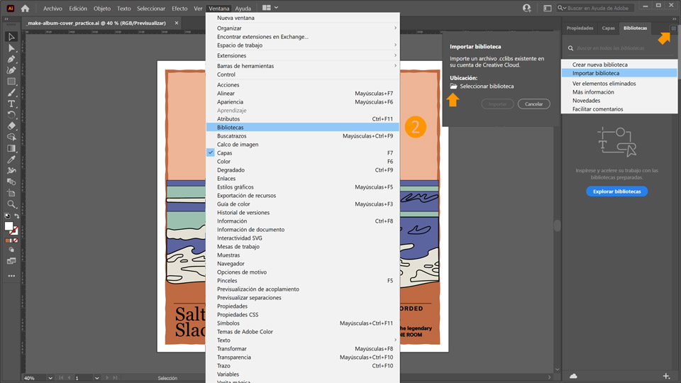 2. Para importar una nueva biblioteca, ve a Ventana > Bibliotecas para abrir el panel Bibliotecas. Haz clic en el icono del menú y elige Importar biblioteca en el menú flotante Bibliotecas. Selecciona la ubicación de la biblioteca haciendo clic en el icono de carpeta y selecciona el archivo “albumcover.cclibs” proporcionado con los archivos de práctica. A continuación, haz clic en Importar y Aceptar.