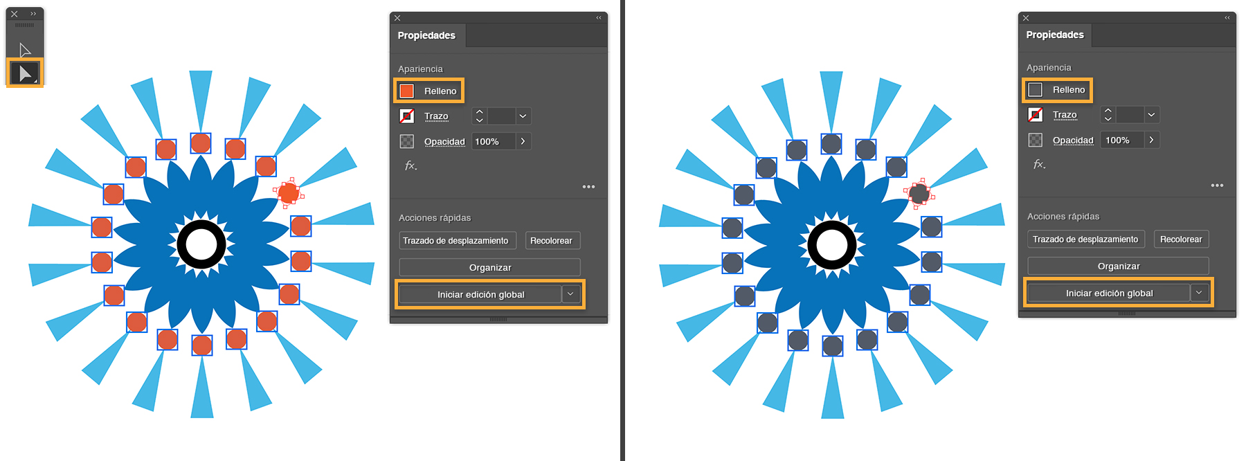 Es muy fácil editar el mandala tras crearlo. Utiliza la herramienta Selección directa para seleccionar el objeto que quieres cambiar y haz clic en Iniciar edición global, en el panel Propiedades. Puedes cambiar el color de relleno, el trazo, la opacidad y demás atributos. Todas las repeticiones de las formas se editarán de manera simultánea. Haz clic en Detener edición global cuando termines de hacer los cambios.
