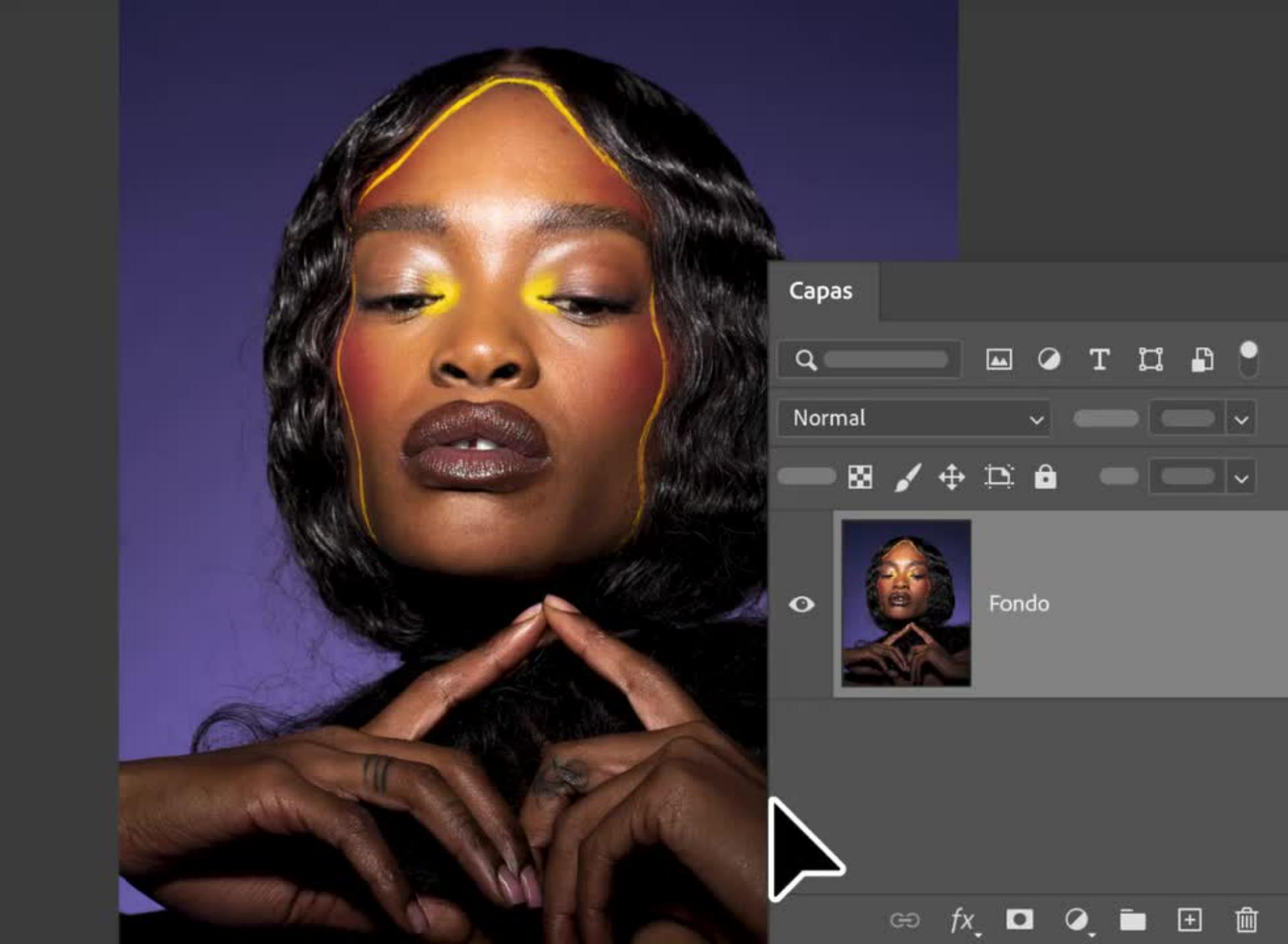 En Photoshop, duplica la capa de fondo y cámbiale el nombre. Selecciona la herramienta Selección de objetos y haz clic en la imagen de la capa Modelo para crear una selección. A continuación, haz clic en el botón Máscara del panel Capas para ocultar el fondo en la capa Modelo.