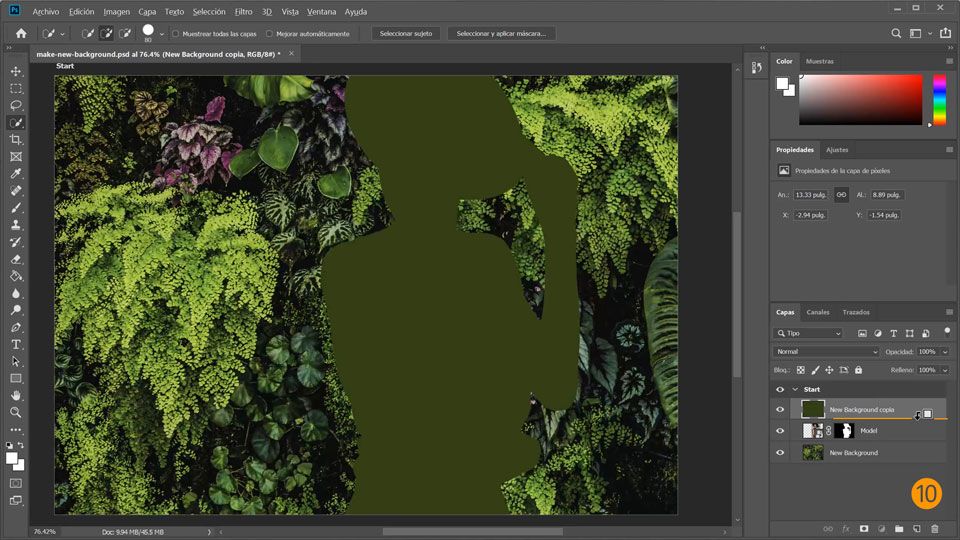 10. Pulsa la tecla Alt y haz clic entre la capa verde y la capa de la modelo para crear una máscara de recorte. El verde rellena el espacio de la modelo.