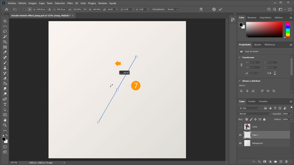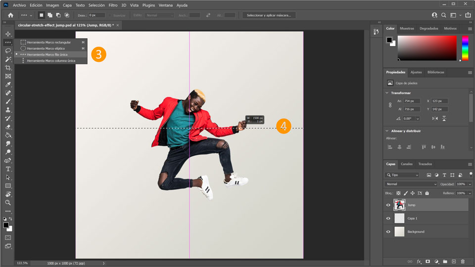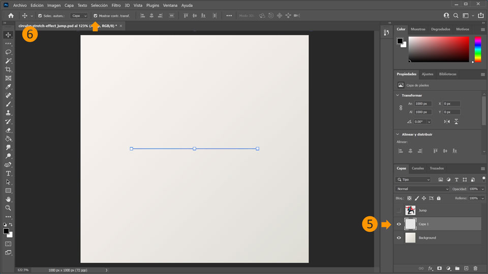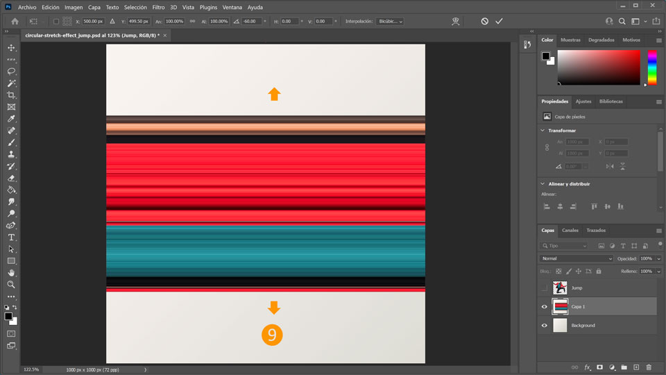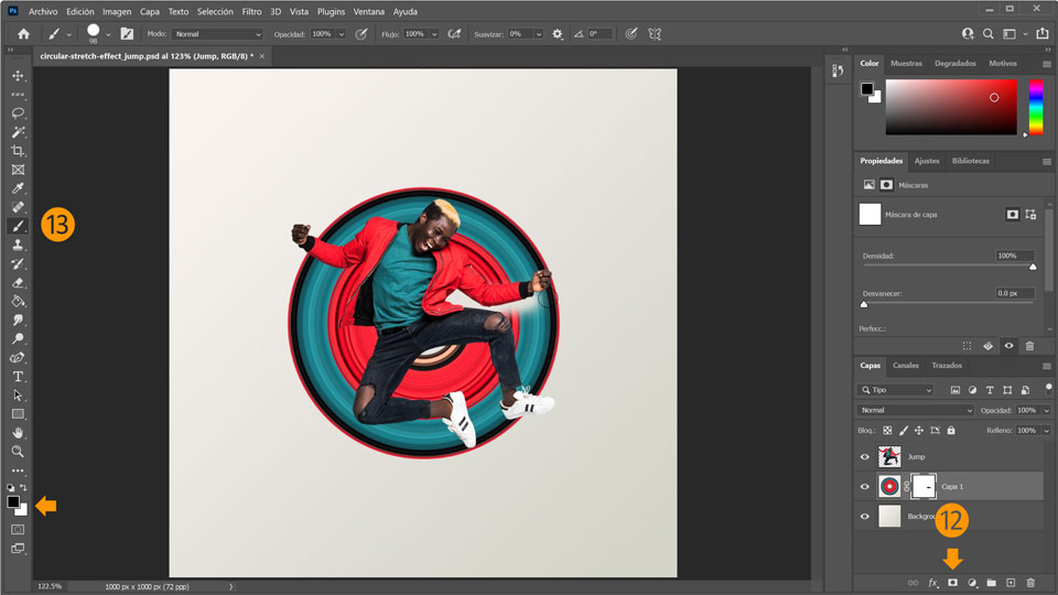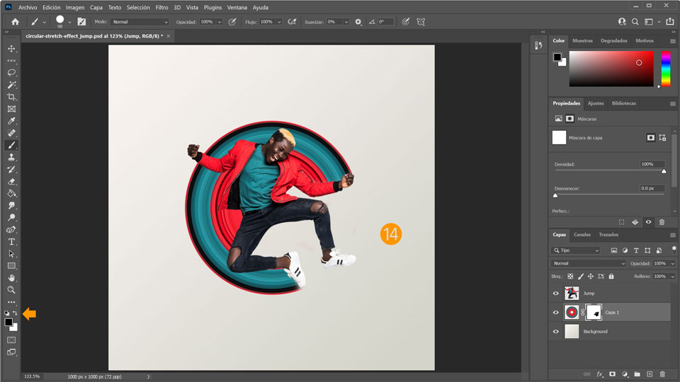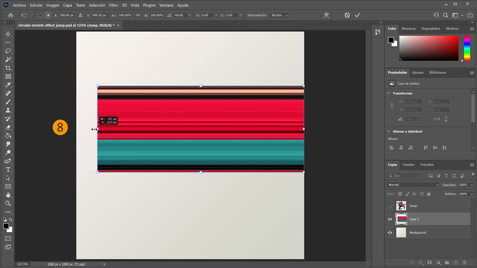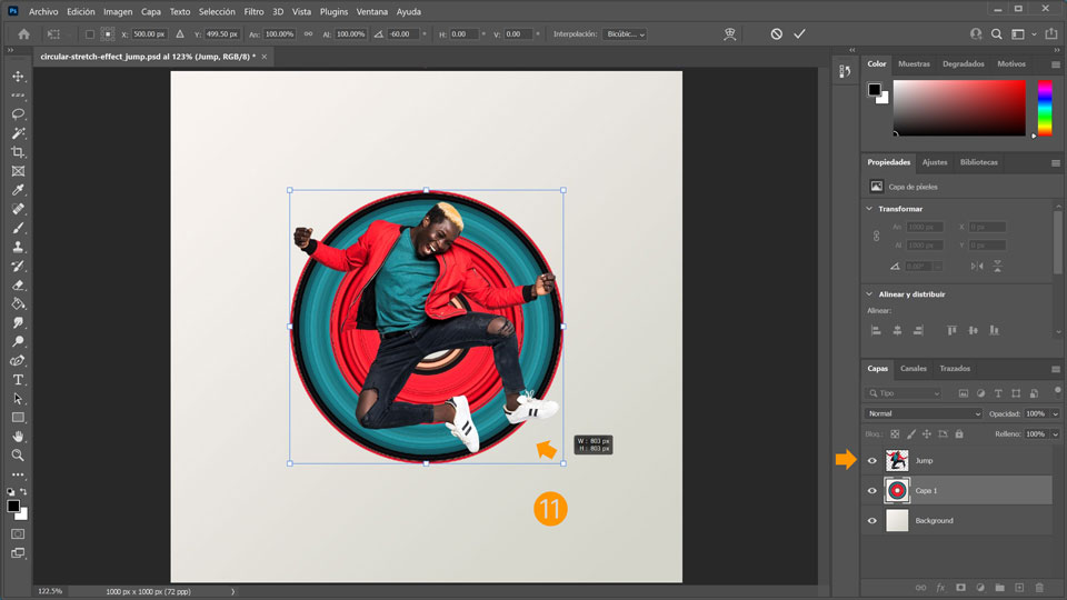 11. Haz que la capa “Saltar” vuelva a ser visible y ajusta el tamaño del estiramiento circular de detrás manteniendo pulsada la tecla Alt y arrastrando el asa.