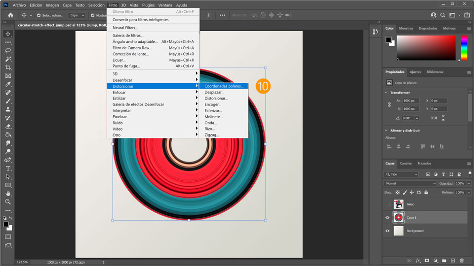 10. En el menú principal, elige Filtro > Distorsionar > Coordenadas polares para transformar el efecto de estiramiento horizontal en uno circular.