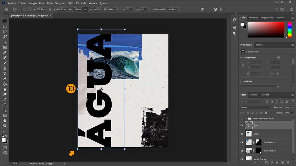 9. Haz clic en la herramienta Mover (V) y desplaza el texto hacia el medio del póster. Después, coloca el ratón junto a la esquina superior derecha del bloque de texto hasta que se convierta en un cursor curvo de dos flechas. Ahora, mantén pulsada la tecla Mayús y gira el texto 90 grados.
