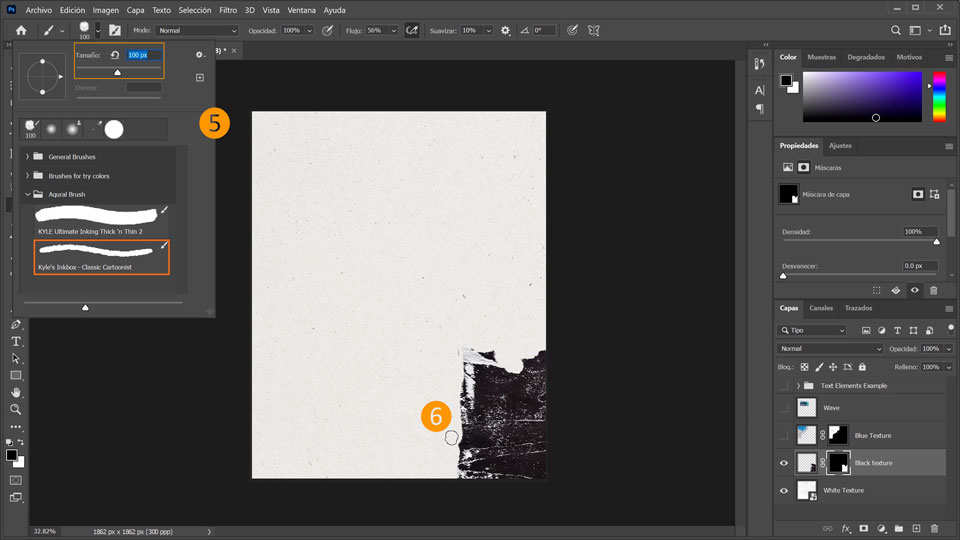 5. Con la Miniatura de máscara de capa todavía seleccionada, haz clic en el Pincel (B) y luego en la flechita situada junto al icono del pincel en la barra superior para configurar el pincel. Selecciona “Kyles Inkbox – Classic cartoonist” en la carpeta Aquarel brush y define un tamaño de 100 px. Comprueba que el color frontal esté definido en negro.