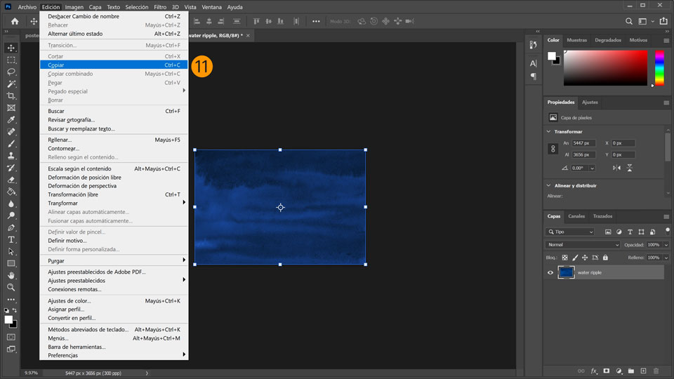 11. Después, abre el archivo “water ripple.psd” y selecciona Edición > Copiar.