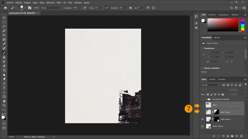 7. Selecciona la capa “Blue Texture”, y luego haz clic en el recuadro situado junto a la miniatura de la capa para visibilizar la capa. Haz lo mismo con la capa “Wave” (aparecerá el icono del ojo, que indica la visibilidad de la capa).