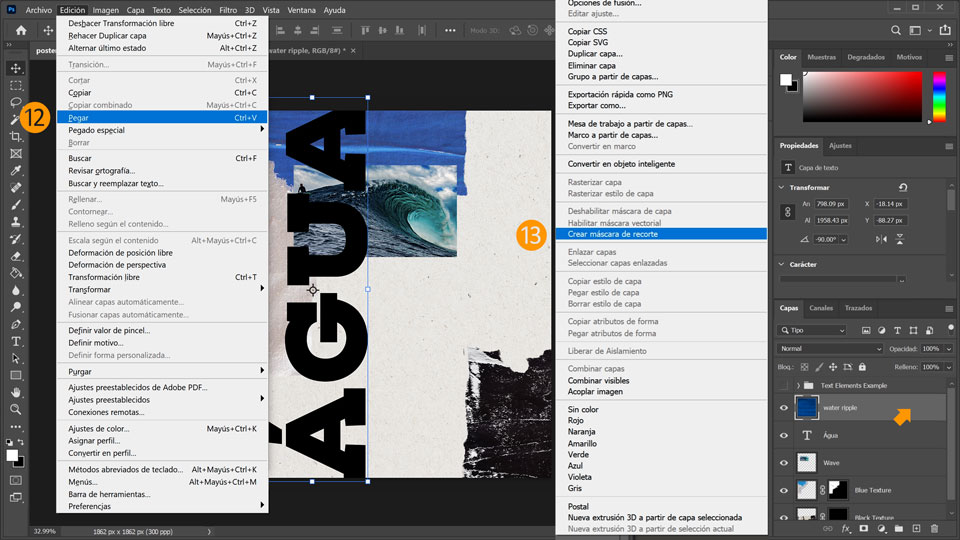 13. Haz clic con el botón secundario en la capa Water Ripple y selecciona Crear máscara de recorte para darle al texto un efecto de ondulación.