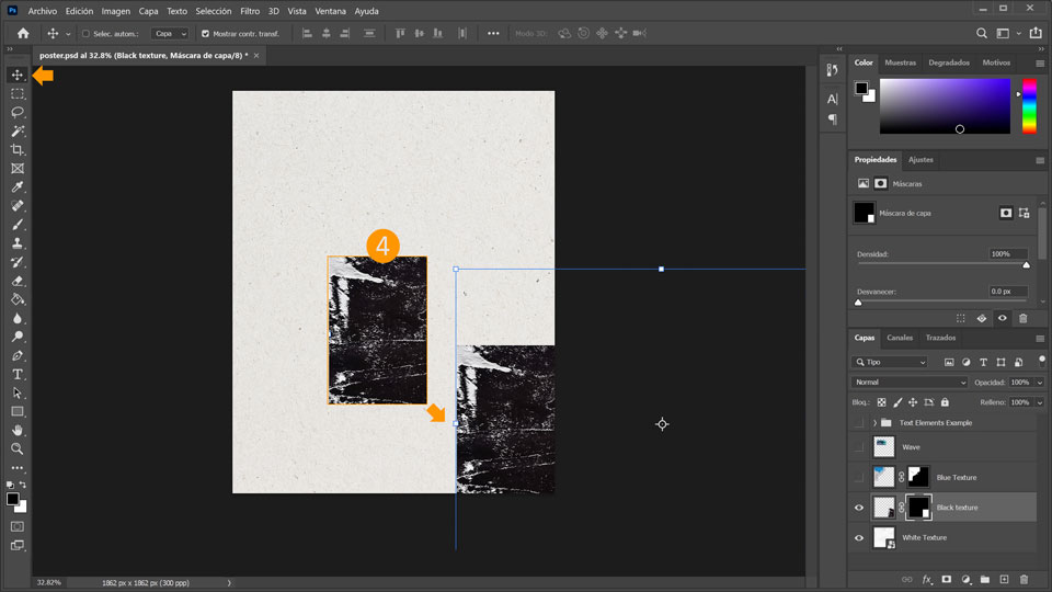 4. Selecciona la herramienta Mover (V) y coloca el rectángulo de la textura negra en la esquina inferior derecha.