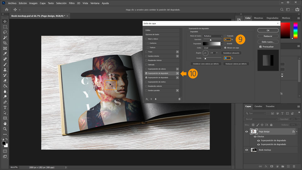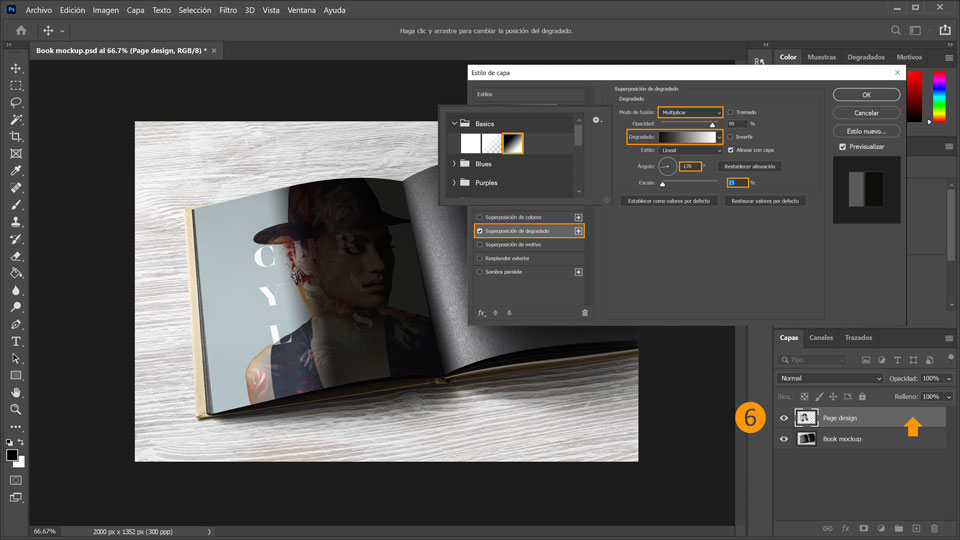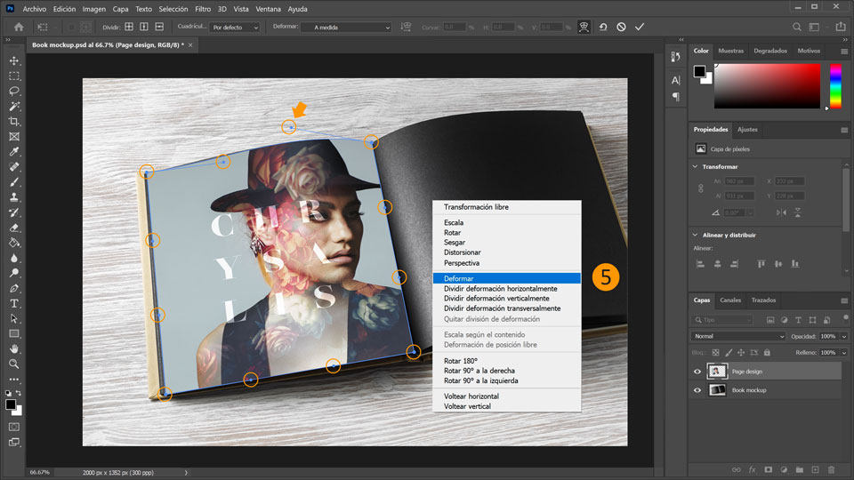 Visualiza tu diseño en un diseño de libro y aplícale un formato y una iluminación realistas con herramientas de Transformar y Estilos de capa.