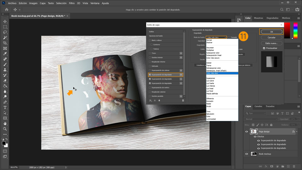 11. Configura Modo de fusión con el valor Trama. Arrastra el degradado de la ilustración para recolocar el resalte sobre el lado izquierdo de la página. Haz clic en Aceptar cuando termines.