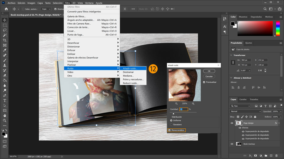 12. Por último, fusionaremos el diseño con el grano del papel. Para ello, selecciona Filtro > Ruido > Añadir ruido. Se abrirá la ventana Añadir ruido. En ella, cambia el valor de Cantidad a 12 % y activa la casilla Monocromo.