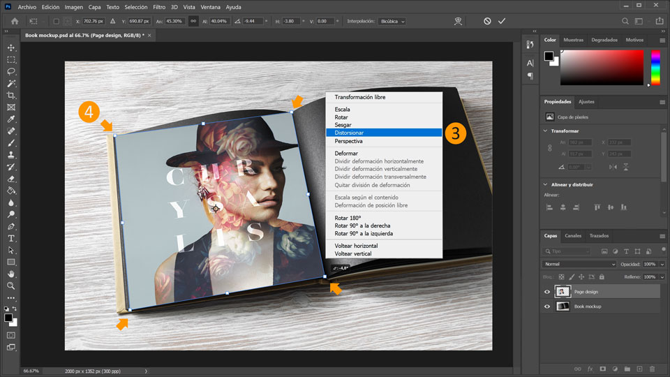 3. Después, transforma el diseño de la página. Con la capa de diseño de la página seleccionada, haz clic con el botón derecho en el diseño de la página y selecciona Distorsionar.
