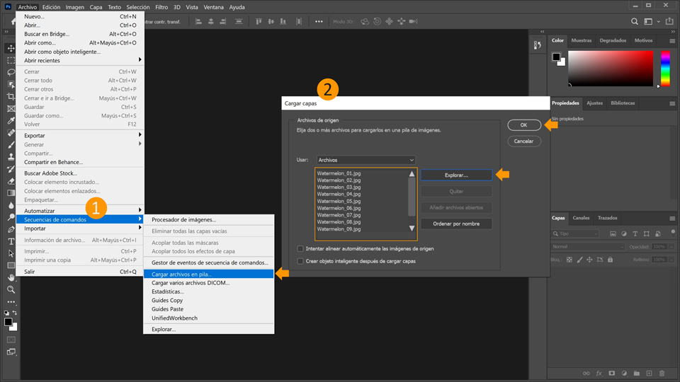 1. Descarga losarchivos de práctica . Verás que hay once archivos de la sandía. No los abras de uno en uno. Carga todos los archivos como capas en un solo archivo: en Photoshop, elige Archivo > Secuencias de comandos > Cargar archivos en pila.